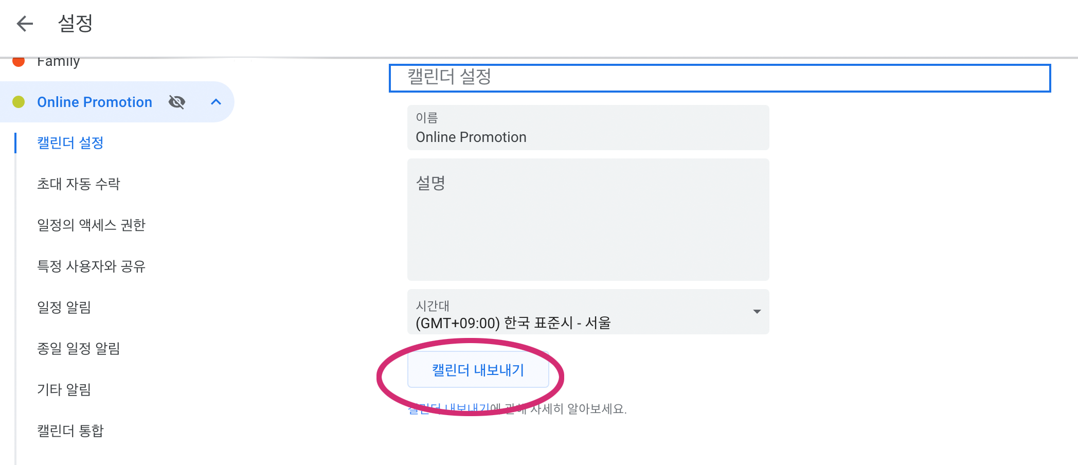 구글 캘린더 내보내기 설정