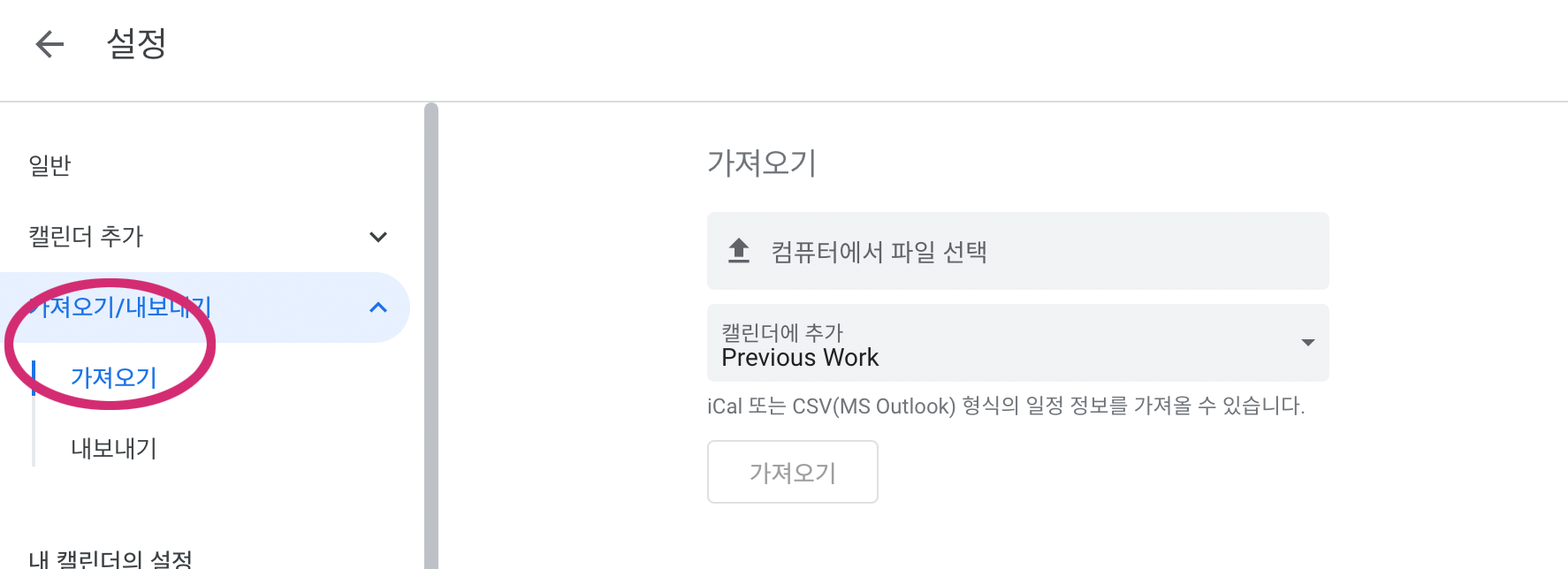 내보내기 한 캘린더는 컴퓨터에서 ics파일을 선택하고, 추가될 캘린더도 선택해 줍니다.