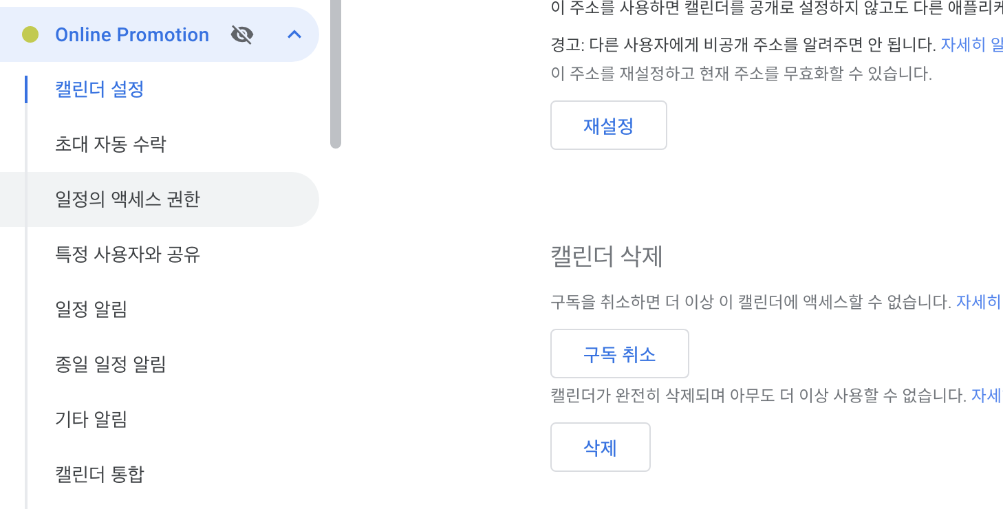 구글 캘린더 설정 > 내 캘린더의 설정 > 삭제