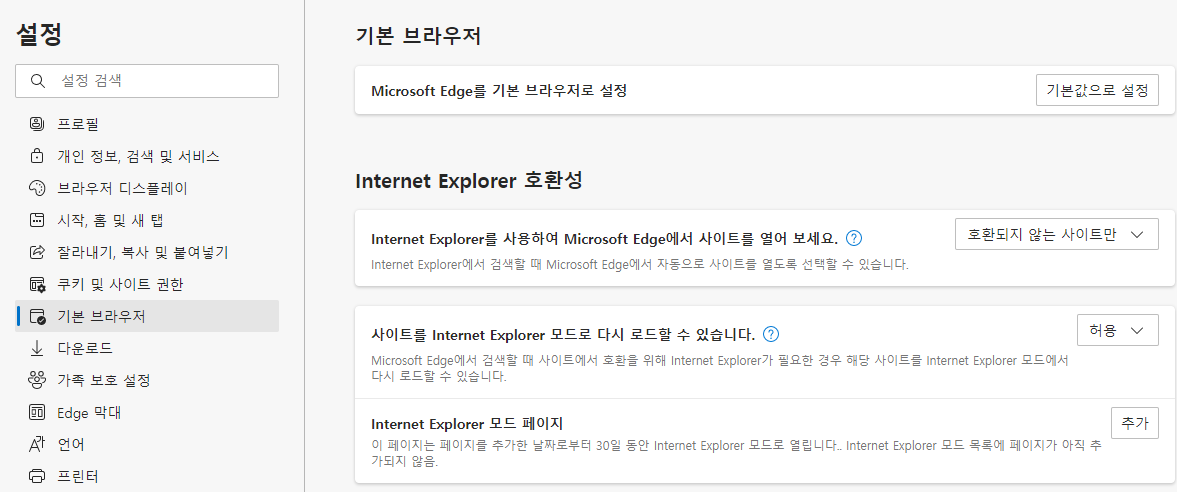 엣지 설정 메뉴로 이동하여 설정 > 기본 브라우저 > Internet Explorer 호환성 하단의